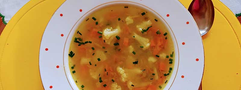 - Povaríme, cibuľu a cesnak roztlačíme a vrátime do polievky a pridáme hrášok a karfiol, 2 polievkové lyžice krupice a prevaríme.